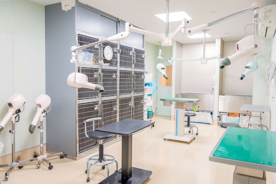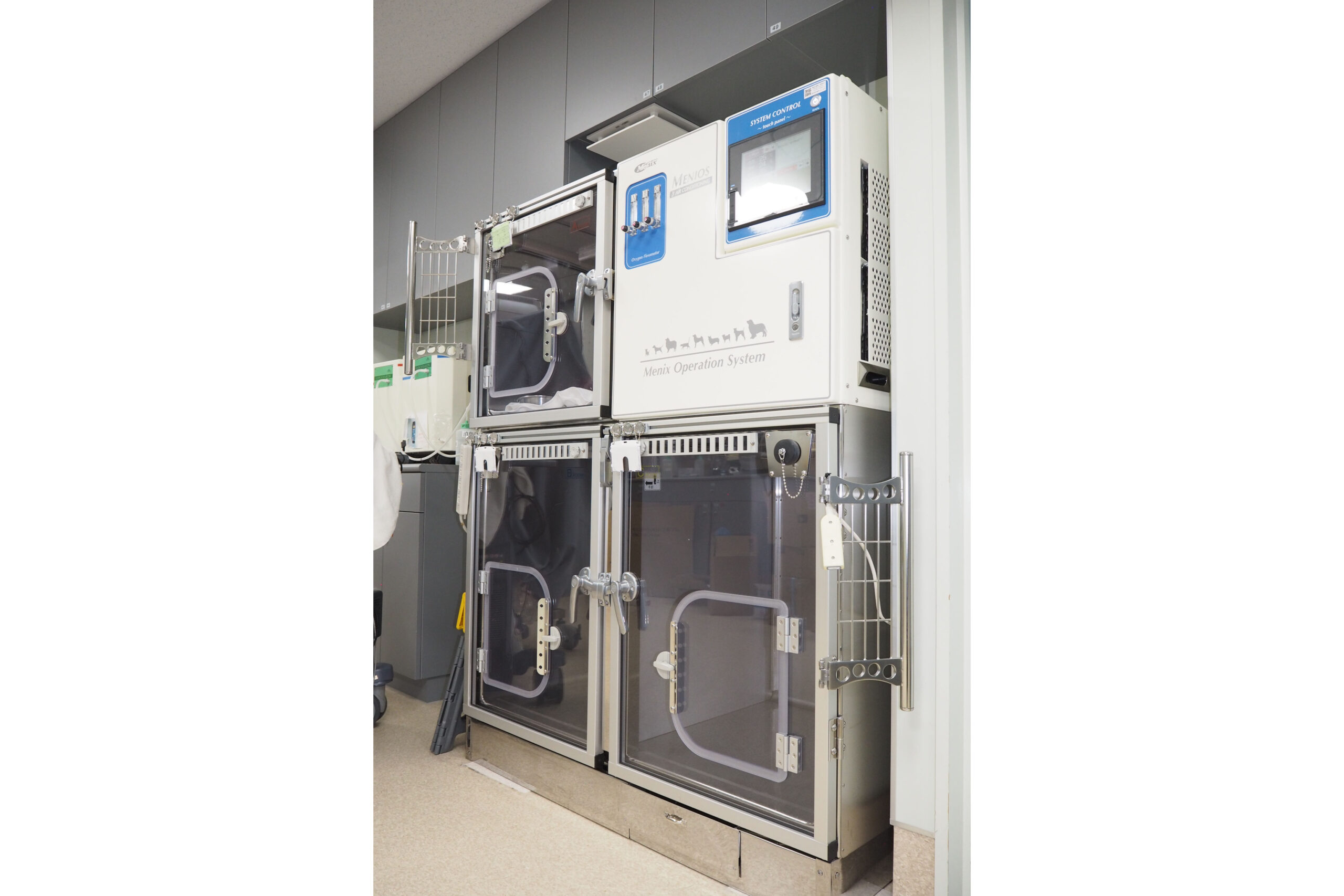ICU(重症動物用)や一般入院室(ホテル、トリミング)があり、点滴や酸素吸入を行います。