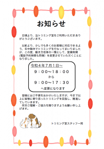 以前より、少しでも多くのお客様に対応できるよう、年中無休でトリミングを行なってまいりましたが、この度、働き方改革の一環として、営業時間(電話予約時間も同様)を変更させていただくことになりました。